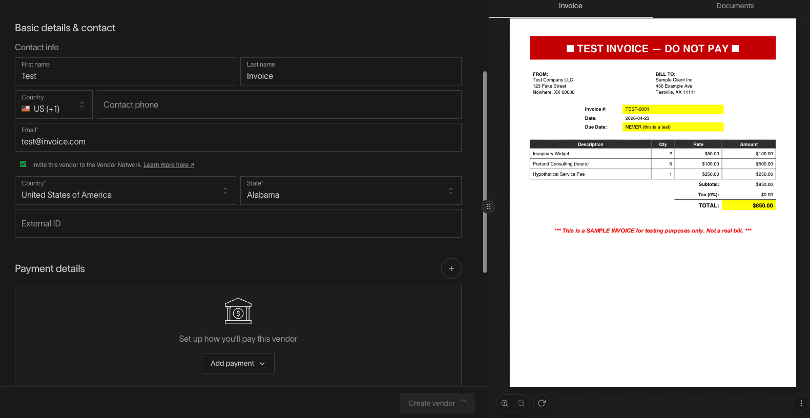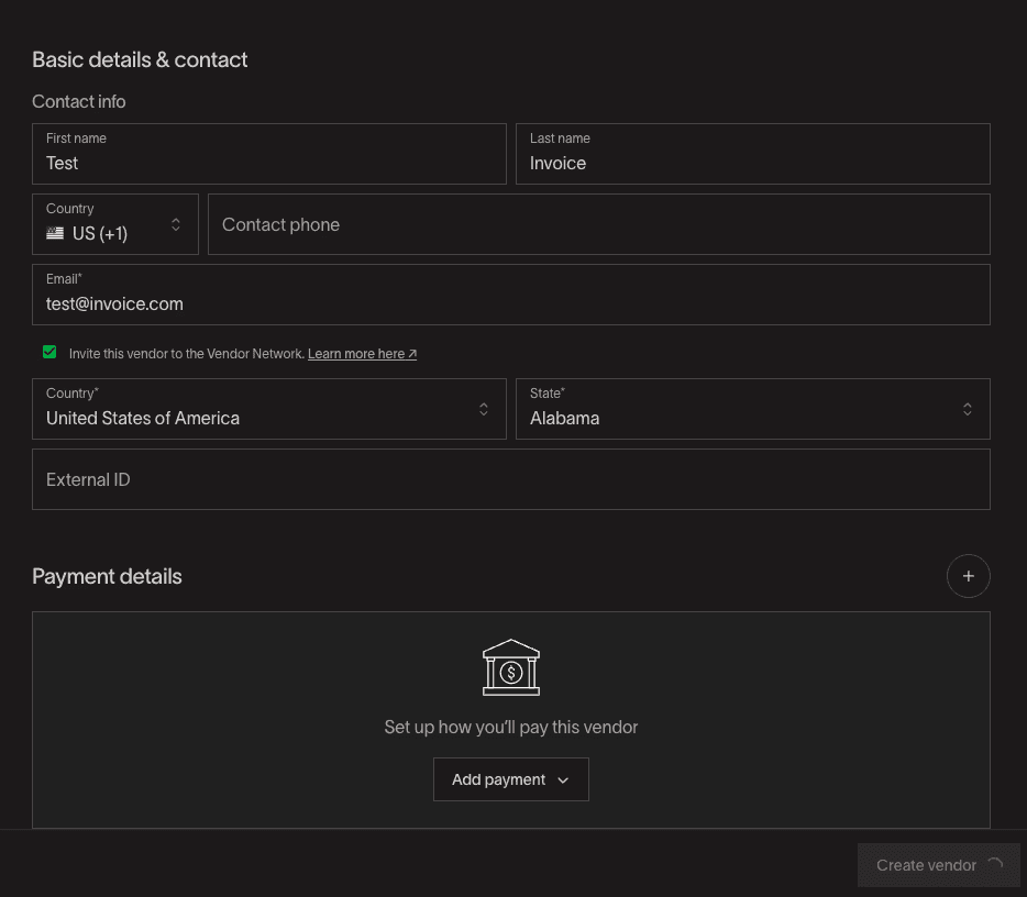Once you've uploaded your invoice, you'll have to set up your vendor by filling out Basic details & contact information