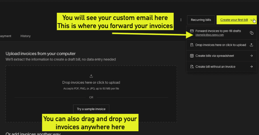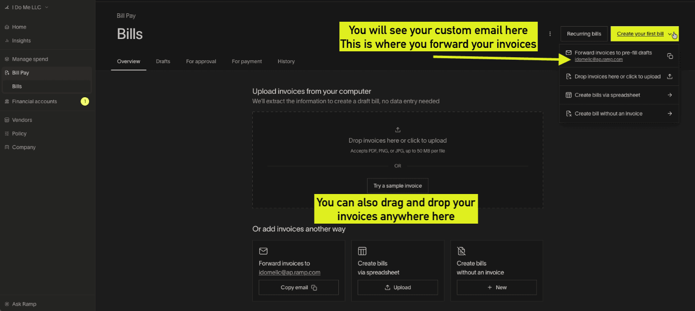 You send bills into Ramp — either by forwarding them to your unique Ramp Bill Pay email or uploading them in the dashboard.