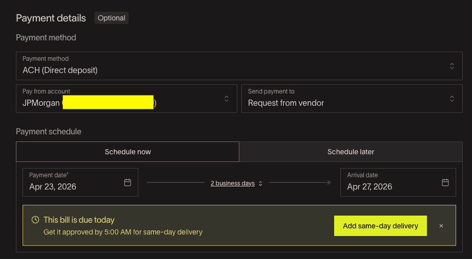 Once approved, you pay the vendor directly through Ramp using the connected bank account, and the payment record stays organized for tracking and bookkeeping.